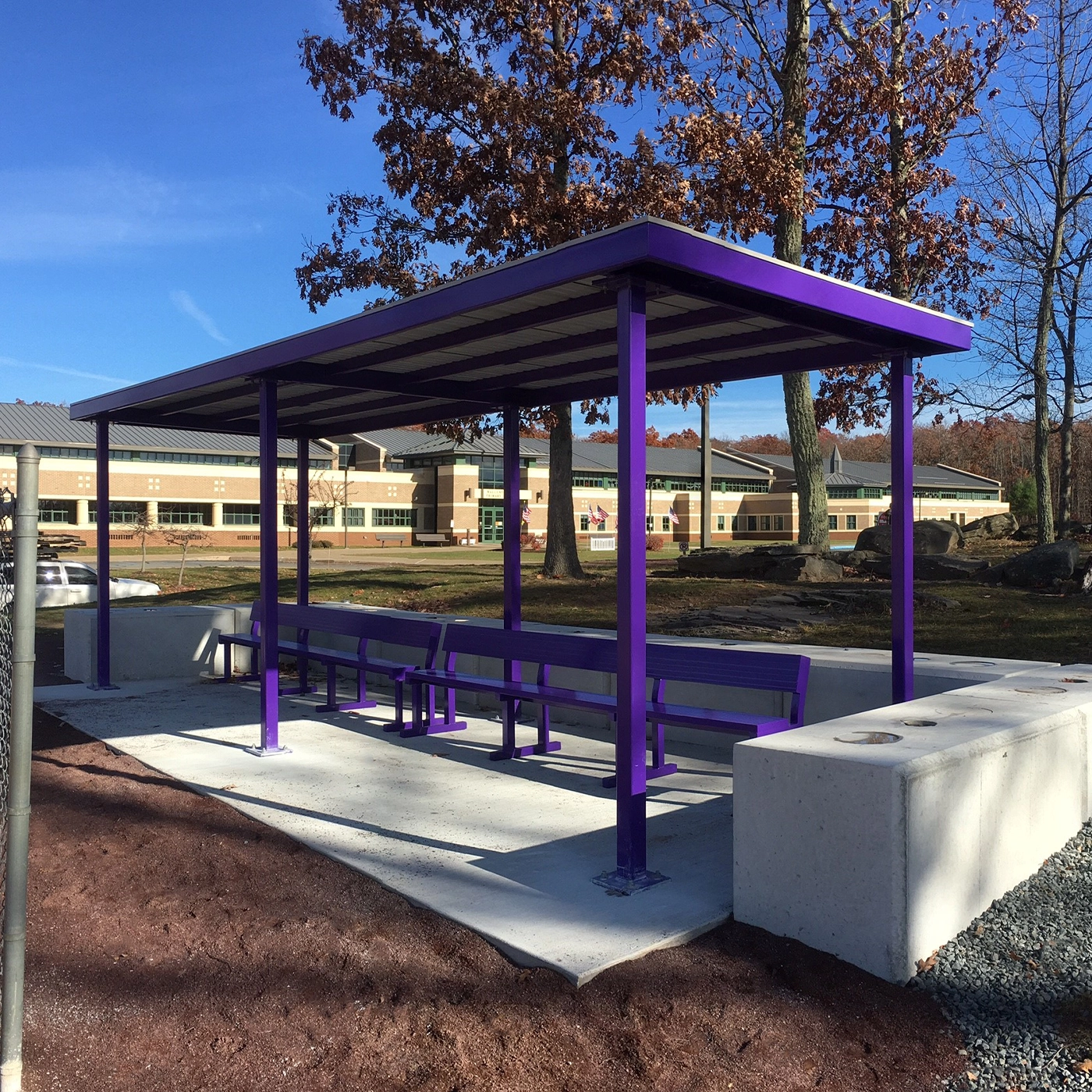These modular dugouts are constructed from a steel frame and corrugated metal roof that are powder coated in a variety of standard colors. The plate mounted design eliminates the need for expensive concrete footings. Windscreen can be added to create an economical enclosed dugout.
