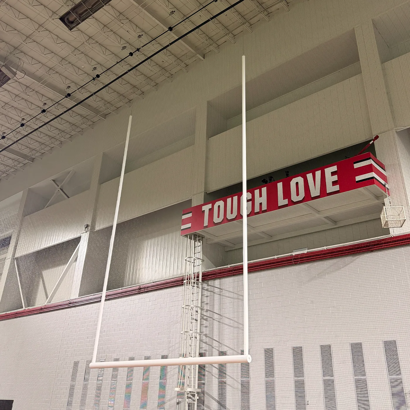 Unlike traditional football goal posts that are anchored to the ground, hanging football goals manufactured by Sportsfield Specialties are suspended from the ceiling. Typically attached to beams, cables, or other overhead support structures, these goal posts are perfect for indoor practice facilities and field houses